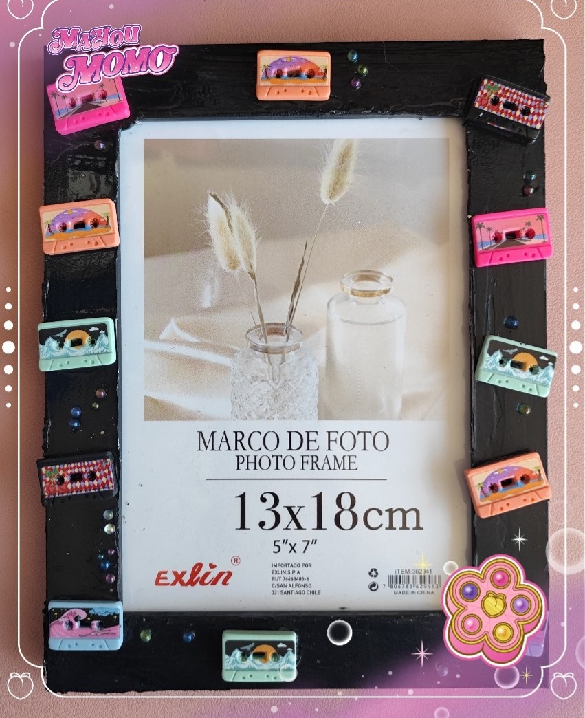 Cuadro - Marco de foto de 13x18 cm con base color negro, capa de brillo transparente, diseños de casette (muy retro) y perlitas de colores de forma aleatoria.