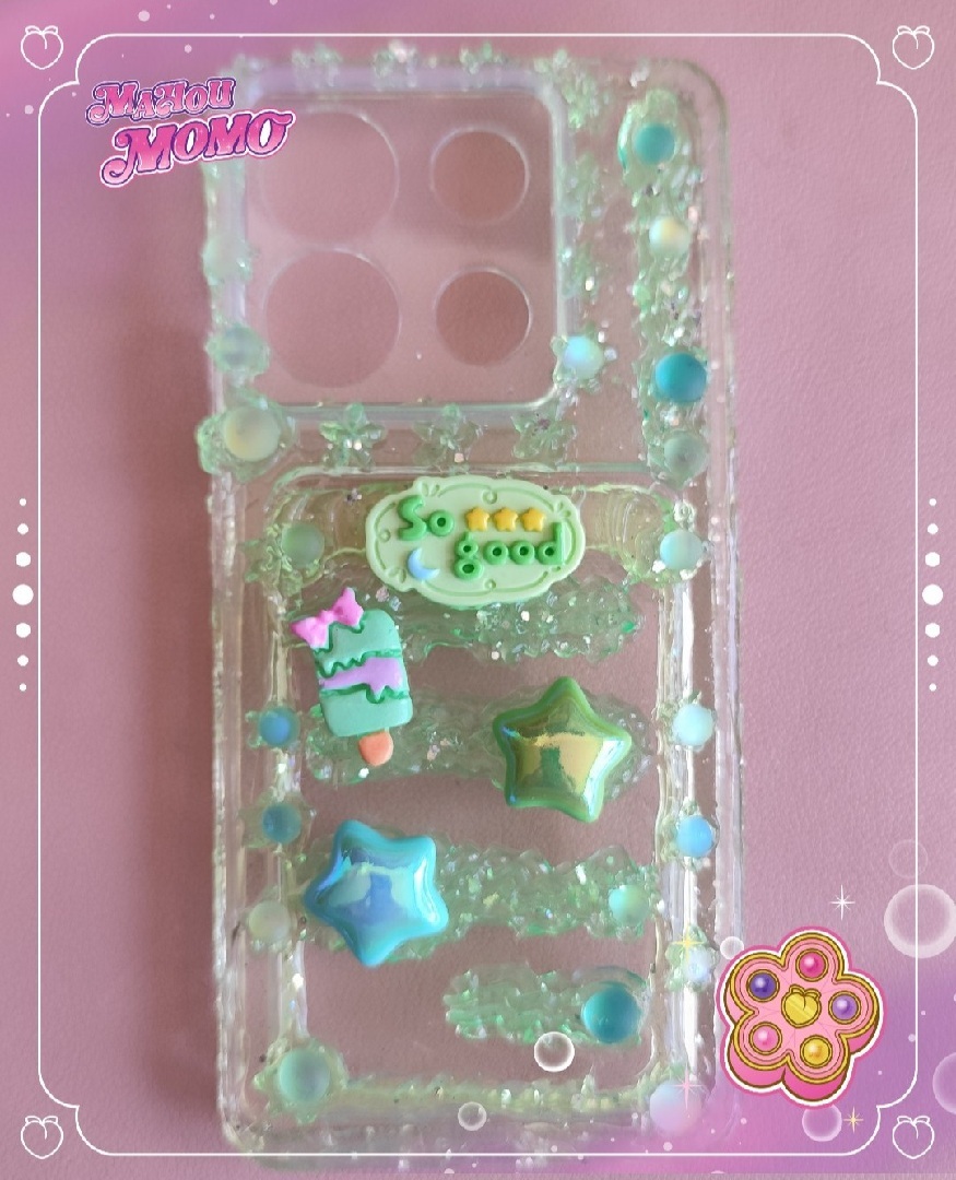 Carcasa XIAOMI REDMI NOTE 13 PRO 5G con base verde transparente y decoraciones de resina y perlas.